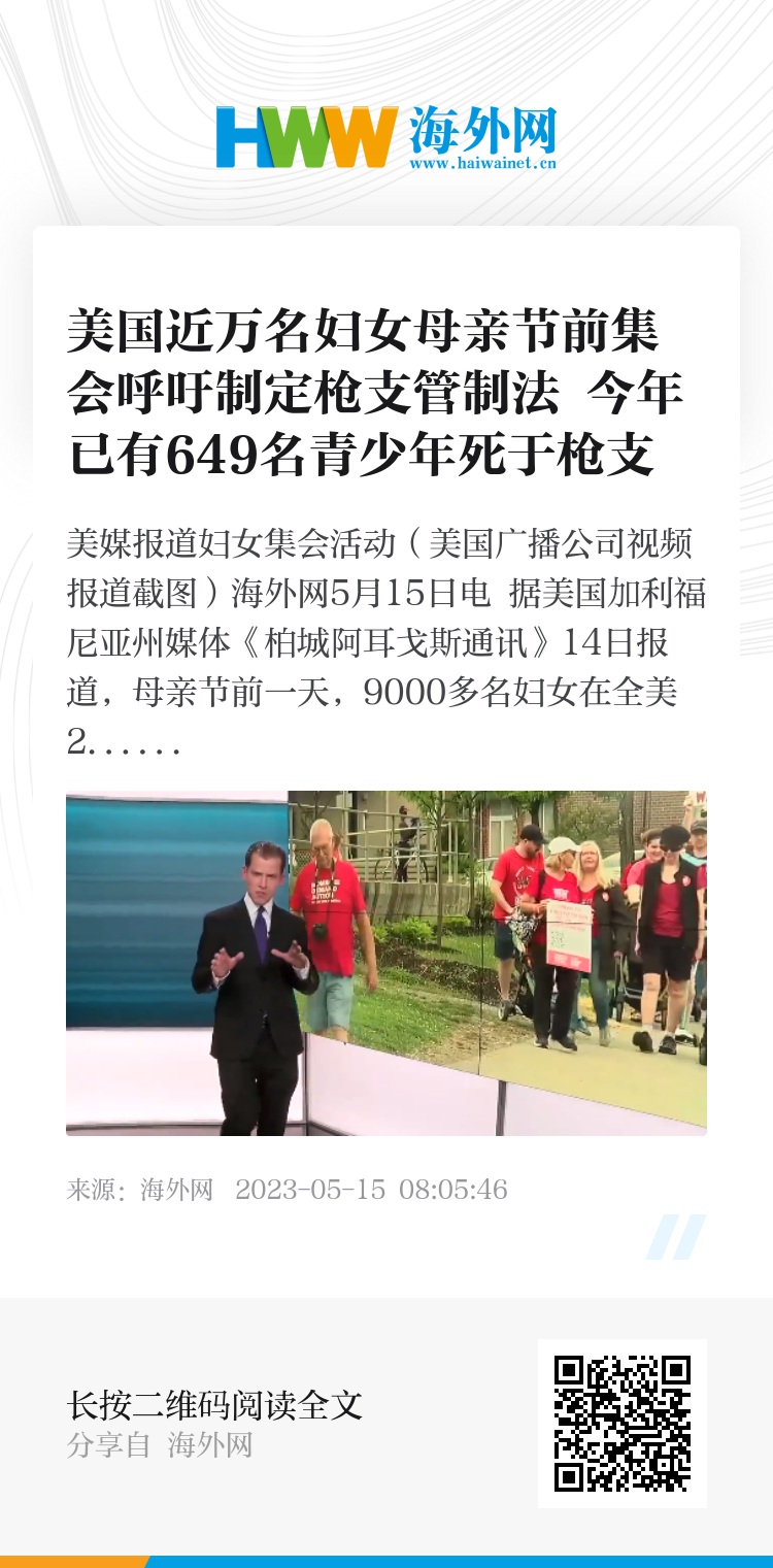 海外网5月15日电 据美国加利福尼亚州媒体《柏城阿耳戈斯通讯》14日报道,母亲节前一天,9000多名妇女在全美200多个城镇举办集会活动,呼吁政府尽快出台枪支管制法。今年已有649名青少年死于枪支,参加者称“不希望每星期都有孩子们死去”。
