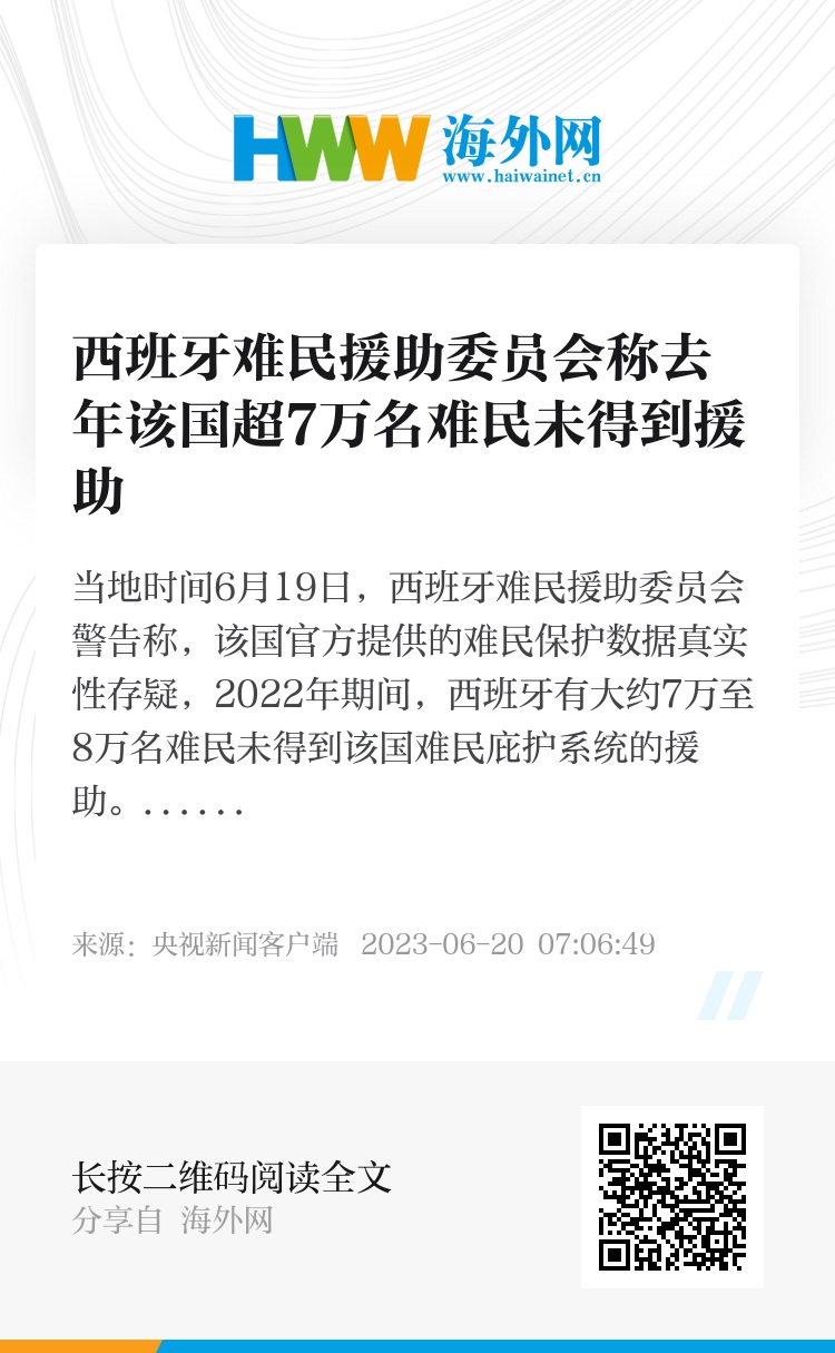 当地时间6月19日,西班牙难民援助委员会警告称,该国官方提供的难民保护数据真实性存疑,2022年期间,西班牙有大约7万至8万名难民未得到该国难民庇护系统的援助。