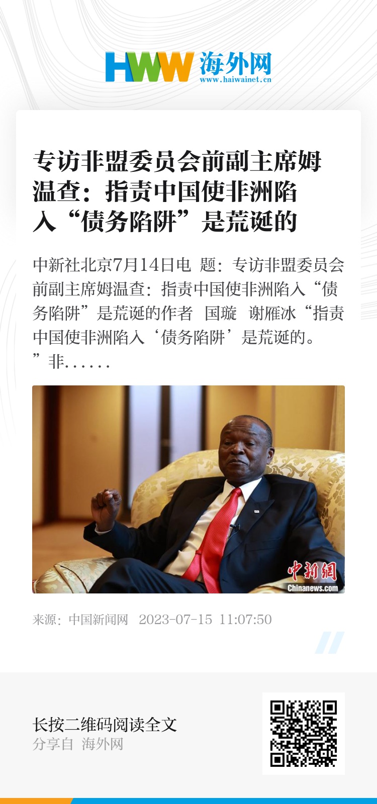 中新社北京7月14日电 题:专访非盟委员会前副主席姆温查:指责中国使非洲陷入“债务陷阱”是荒诞的