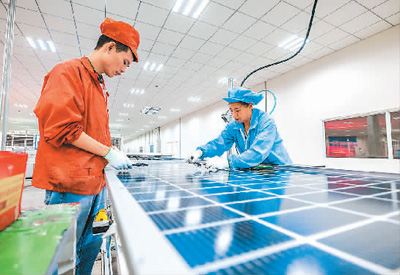 贵州省毕节市威宁彝族回族苗族自治县新能源产业园里,工作人员在光伏板组件生产线上作业。罗大富摄(人民图片)