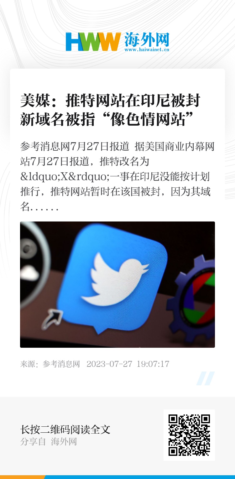 参考消息网7月27日报道 据美国商业内幕网站7月27日报道,推特改名为“X”一事在印尼没能按计划推行,推特网站暂时在该国被封,因为其域名此前曾被发布“负面”内容的网站所使用。