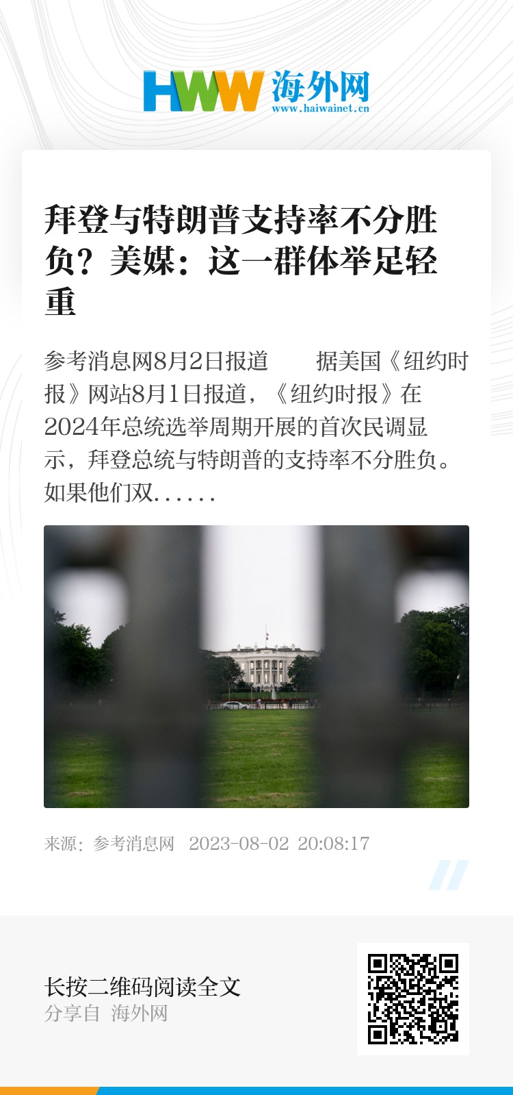 参考消息网8月2日报道 据美国《纽约时报》网站8月1日报道,《纽约时报》在2024年总统选举周期开展的首次民调显示,拜登总统与特朗普的支持率不分胜负。如果他们双双成为明年总统大选的候选人,那么有43%的注册选民表示将支持拜登,同时另外43%的注册选民表示将支持特朗普。
