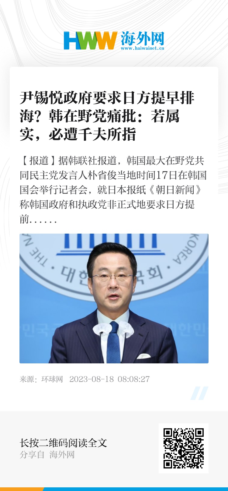 【环球网报道】据韩联社报道,韩国最大在野党共同民主党发言人朴省俊当地时间17日在韩国国会举行记者会,就日本报纸《朝日新闻》称韩国政府和执政党非正式地要求日方提前排放福岛核污染水一事表示,如果有关报道属实,必遭千夫所指。