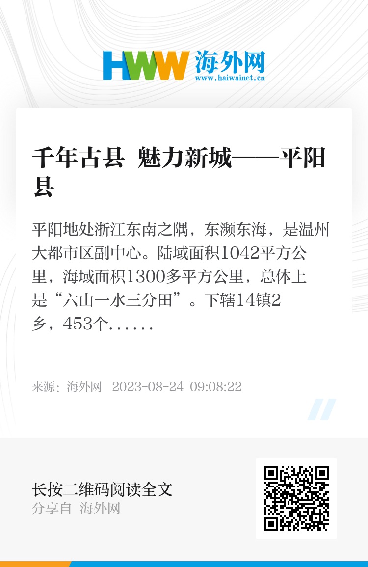 平阳是一个历史悠久、人杰地灵的千年古县。建县距今已有1700多年历史,是中国地名文化遗产“千年古县”,历代文化名人辈出,有《富春山居图》作者黄公望、数学泰斗苏步青、“百岁棋王”谢侠逊等杰出代表,享誉中外。