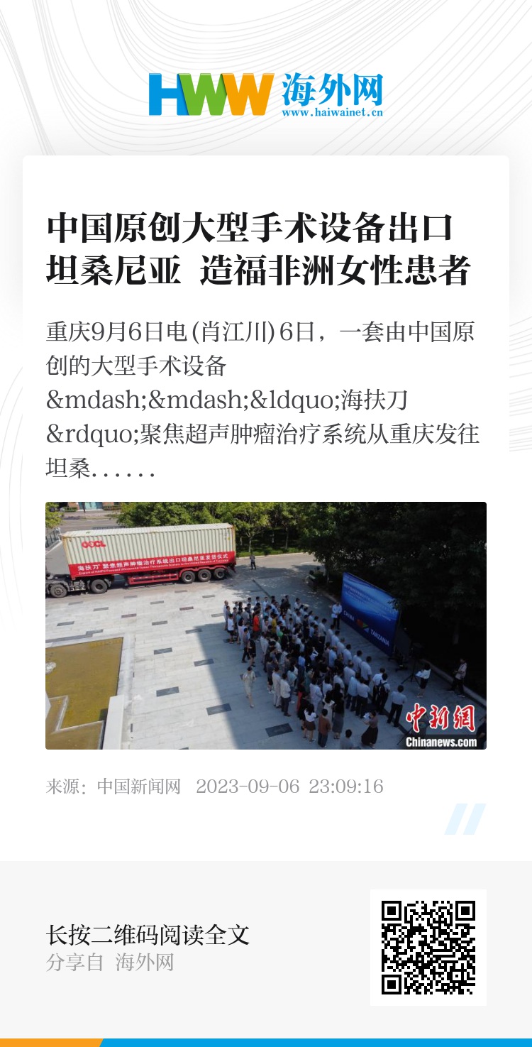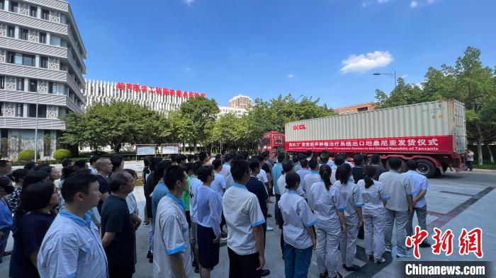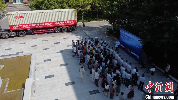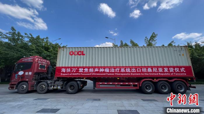 中新网重庆9月6日电(肖江川)6日,一套由中国原创的大型手术设备——“海扶刀”聚焦超声肿瘤治疗系统从重庆发往坦桑尼亚。这套世界领先的微无创手术设备将用于该国临床治疗及研究,从而造福于非洲女性患者。