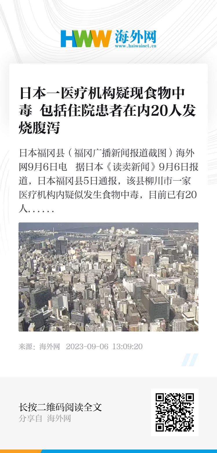 海外网9月6日电 据日本《读卖新闻》9月6日报道,日本福冈县5日通报,该县柳川市一家医疗机构内疑似发生食物中毒,目前已有20人出现身体不适的情况。