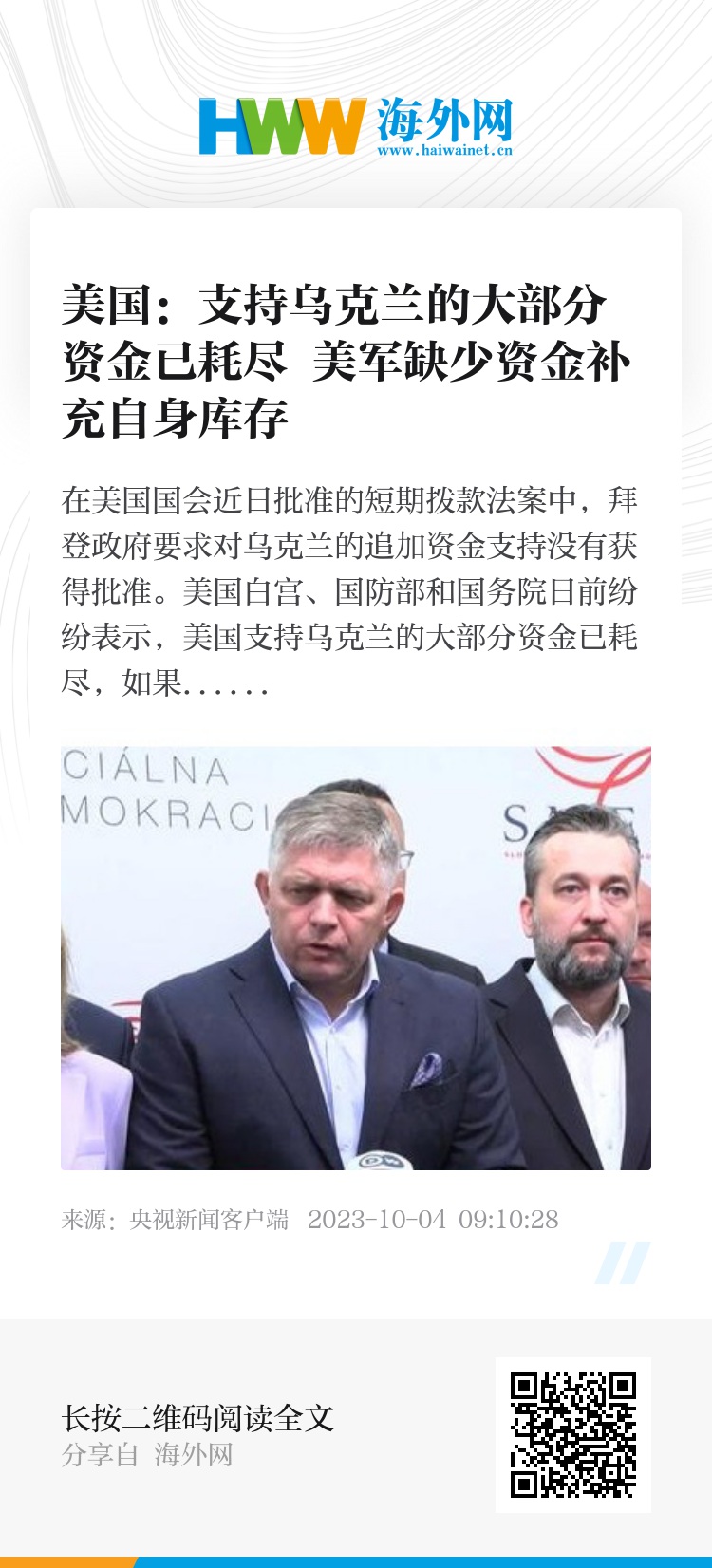 斯洛伐克方向党领导人 罗伯特·菲佐:我现在想要说的是,斯洛伐克和斯洛伐克人民目前面临的问题比乌克兰更大。我不赞同欧盟在一些问题上没有自己的立场,只是盲目追随美国,我们一直这样。