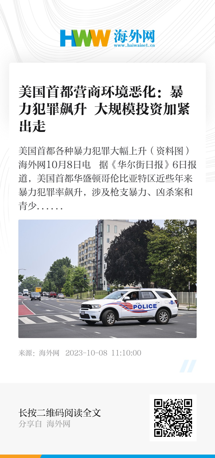海外网10月8日电 据《华尔街日报》6日报道,美国首都华盛顿哥伦比亚特区近些年来暴力犯罪率飙升,涉及枪支暴力、凶杀案和青少年劫车等犯罪,使得当地一些企业陷入困境,大规模投资正加紧出走。