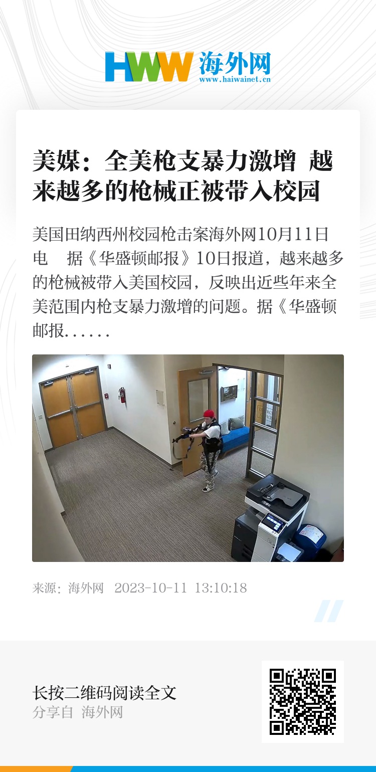 海外网10月11日电 据《华盛顿邮报》10日报道,越来越多的枪械被带入美国校园,反映出近些年来全美范围内枪支暴力激增的问题。