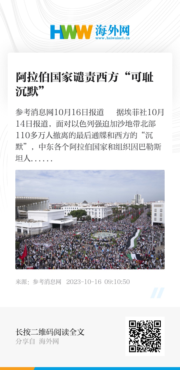 参考消息网10月16日报道 据埃菲社10月14日报道,面对以色列强迫加沙地带北部110多万人撤离的最后通牒和西方的“沉默”,中东各个阿拉伯国家和组织因巴勒斯坦人民正在遭受的“战争罪行”几乎没有受到国际谴责而表现出沮丧和苦涩。