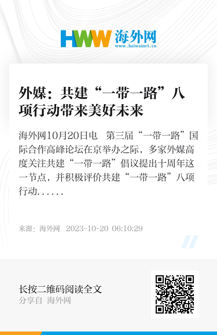 海外网10月20日电 第三届“一带一路”国际合作高峰论坛在京举办之际,多家外媒高度关注共建“一带一路”倡议提出十周年这一节点,并积极评价共建“一带一路”八项行动。