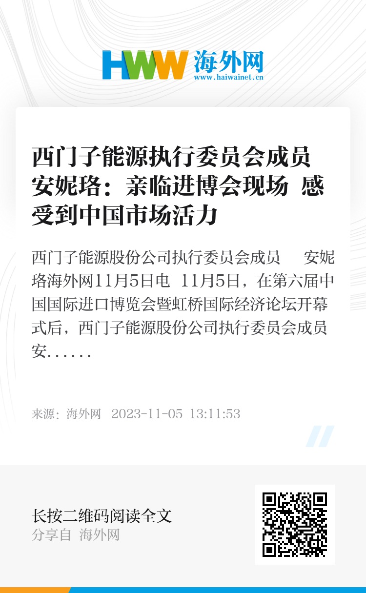 海外网11月5日电 11月5日,在第六届中国国际进口博览会暨虹桥国际经济论坛开幕式后,西门子能源股份公司执行委员会成员安妮珞表示,今年是她第一次亲临进博会的现场。不论开幕式传递的“虹桥声音”,还是亲眼看到的一个个繁荣多彩的展台,都在证明中国市场的活力、潜力和巨大的吸引力。今年,包括西门子能源在内130多家德国企业参加进博会,这充分表明了德国企业对中国发展的信心。
