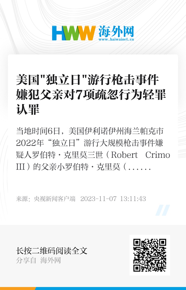 当地时间6日,美国伊利诺伊州海兰帕克市2022年“独立日”游行大规模枪击事件嫌疑人罗伯特·克里莫三世(Robert Crimo III)的父亲小罗伯特·克里莫(Robert Crimo Jr)接受了七项疏忽行为轻罪的指控。小罗伯特·克里莫与检察官达成了认罪协议,接受了两年的缓刑、60天的监禁以及100小时的社区服务,将于11月15日入狱服刑。