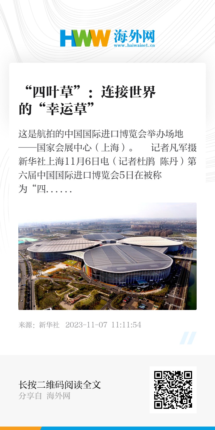 新华社上海11月6日电(记者杜鹃 陈丹)第六届中国国际进口博览会5日在被称为“四叶草”的国家会展中心(上海)开幕。该中心因形似四叶草而得此昵称。