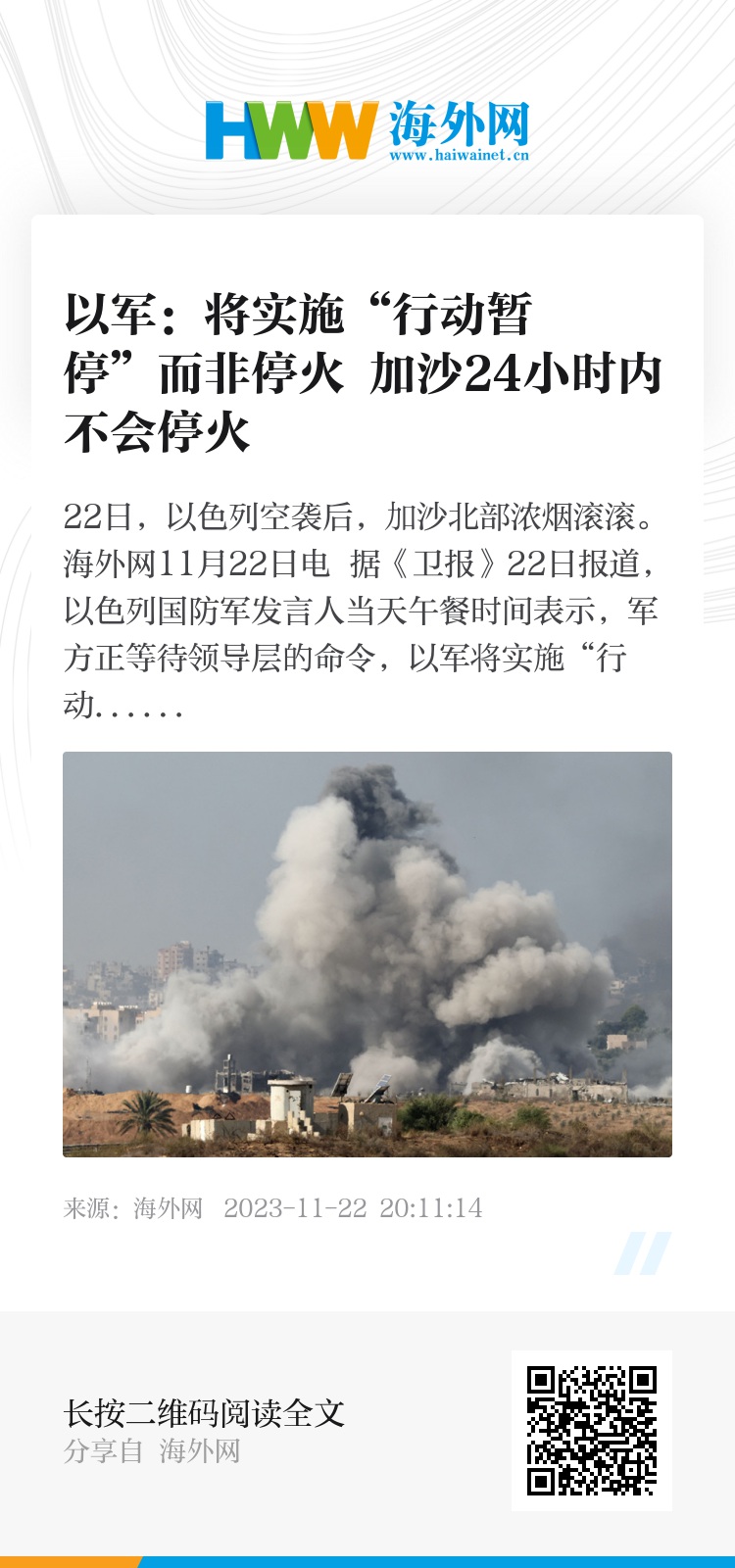 以军国际发言人赫克特表示,“我们的术语不是停火,而是行动暂停”,暗示双方一旦完成被扣押人员的交换,以色列就可能重新开始轰炸加沙地带。赫克特表示,由于尚未收到领导层的命令,他无法确认何时停火或停火将如何精确实施。但赫克特明确表示,从现在起24小时内,加沙可能不会开始停火。“我们可能还有一天多的时间。我认为今天将是在加沙继续战斗的一天”,他说。