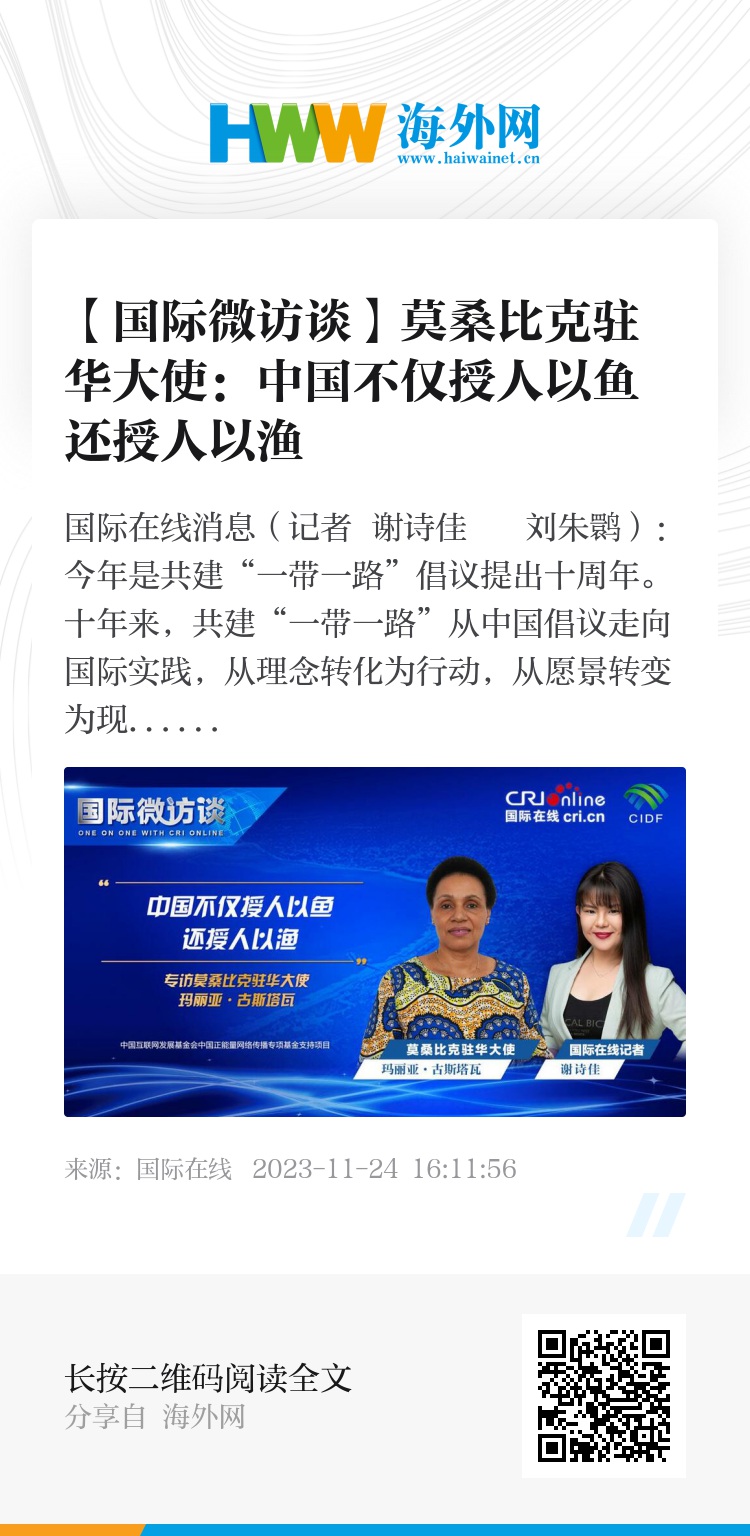 国际在线消息(记者 谢诗佳 刘朱鹮):今年是共建“一带一路”倡议提出十周年。十年来,共建“一带一路”从中国倡议走向国际实践,从理念转化为行动,从愿景转变为现实,取得实打实、沉甸甸的成就。对此,《国际微访谈》栏目推出“对话大使·全球治理进程中的中国担当”系列节目,专访多位“一带一路”共建国家的驻华大使,畅聊“一带一路”十年来取得的成就,并对未来在“一带一路”框架下的双边合作进行展望。