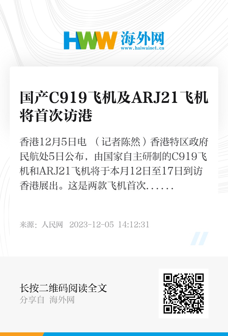 人民网香港12月5日电 (记者陈然)香港特区政府民航处5日公布,由国家自主研制的C919飞机和ARJ21飞机将于本月12日至17日到访香港展出。这是两款飞机首次访港,其中C919飞机更是首次出访中国内地以外的城市。期间C919及ARJ21飞机将在香港国际机场进行静态展示,C919飞机更会于维多利亚港上空进行飞行演示,让市民共同见证C919飞机首次翱翔香港上空的一刻。