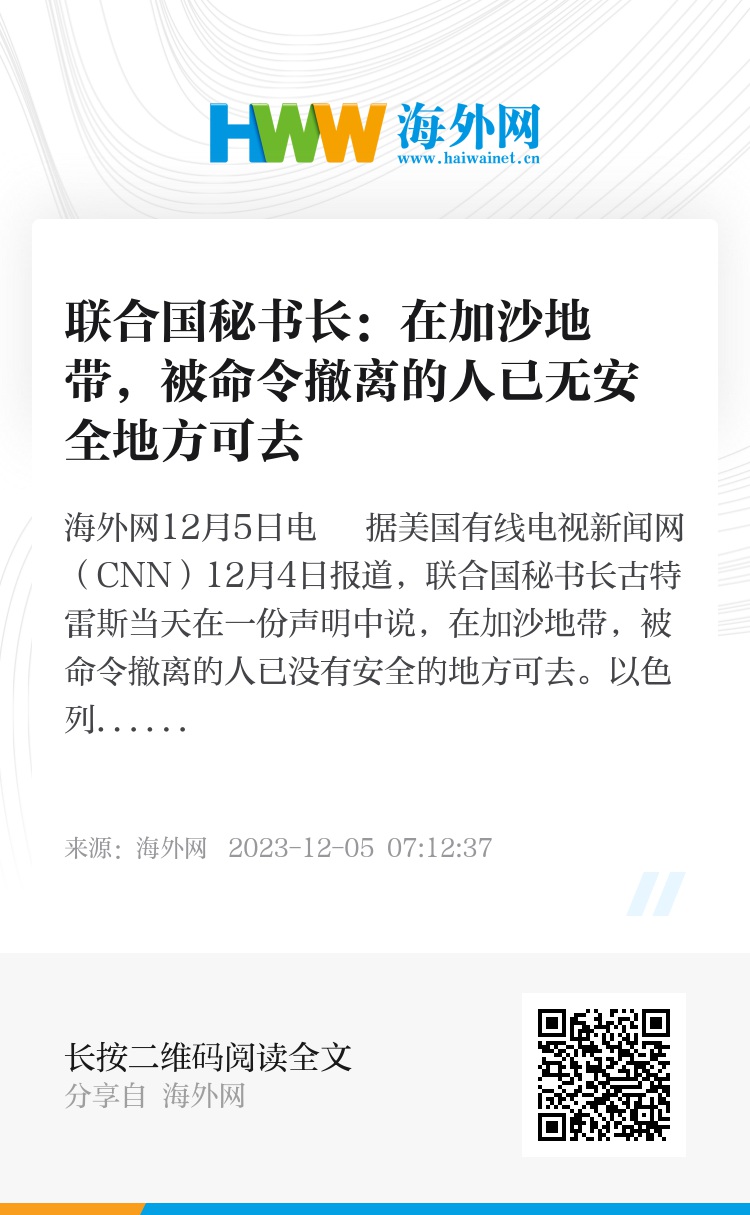 海外网12月5日电 据美国有线电视新闻网(CNN)12月4日报道,联合国秘书长古特雷斯当天在一份声明中说,在加沙地带,被命令撤离的人已没有安全的地方可去。