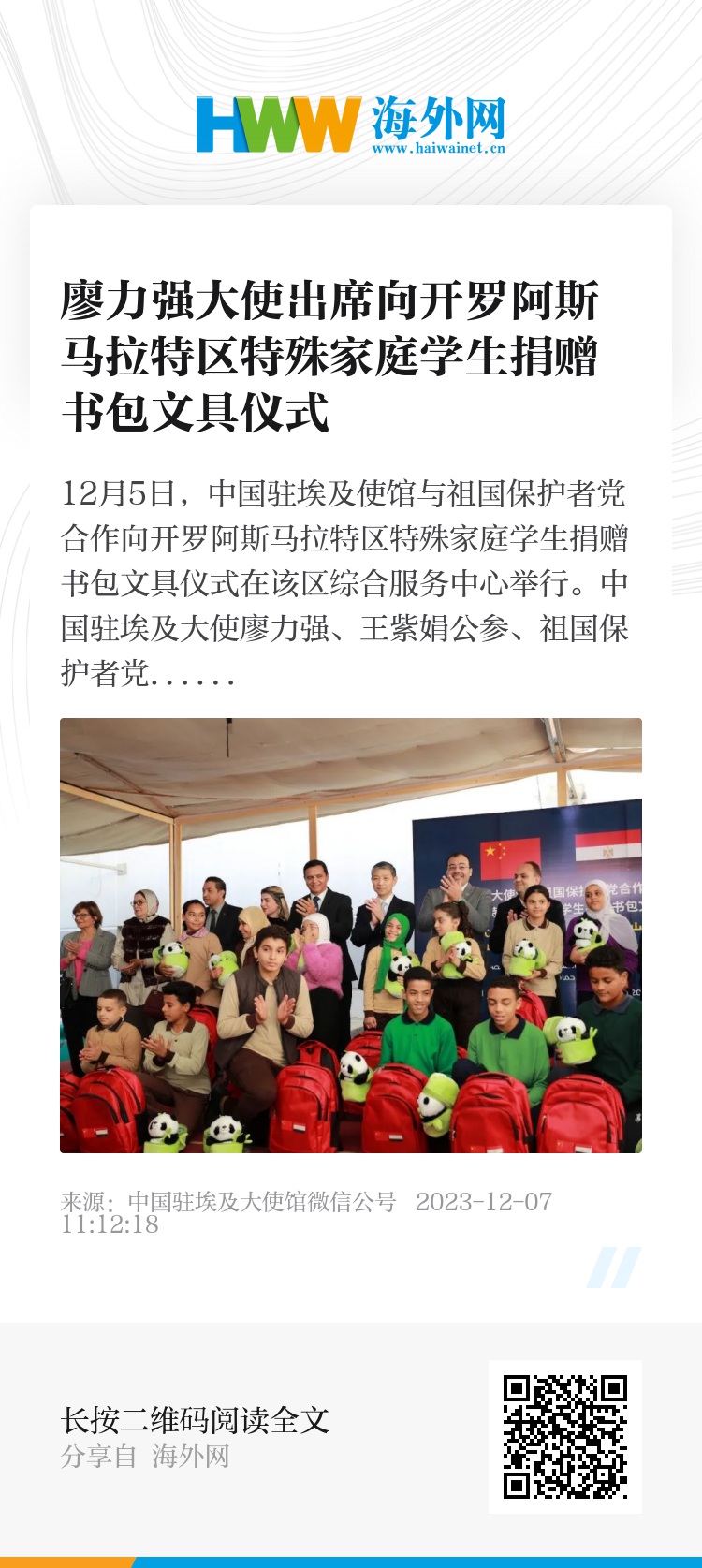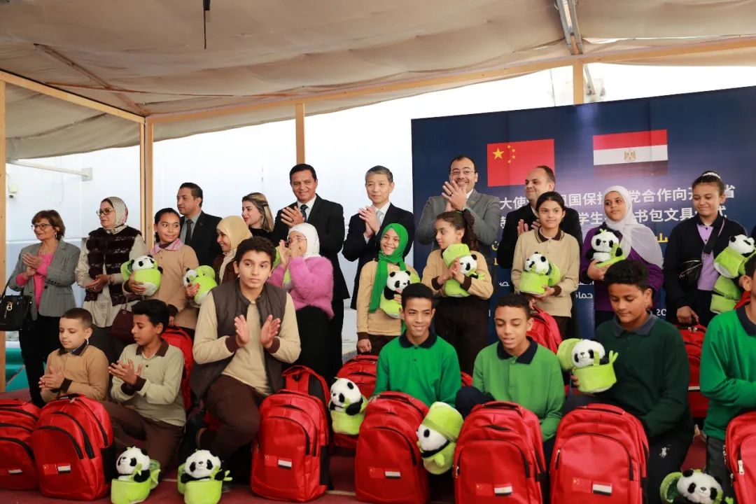 廖力强大使表示,在习近平主席和塞西总统引领擘画下,中埃关系成为中国同阿拉伯、非洲、发展中国家团结合作、互利共赢的典范。塞西总统高度重视保障和改善民生,阿斯马拉特区是他提出的“体面生活”倡议项下首个棚户区改造项目,中国使馆与祖国保护者党合作向该区学生捐赠书包文具,旨在表达对“体面生活”倡议的支持,增进中埃人民友好。