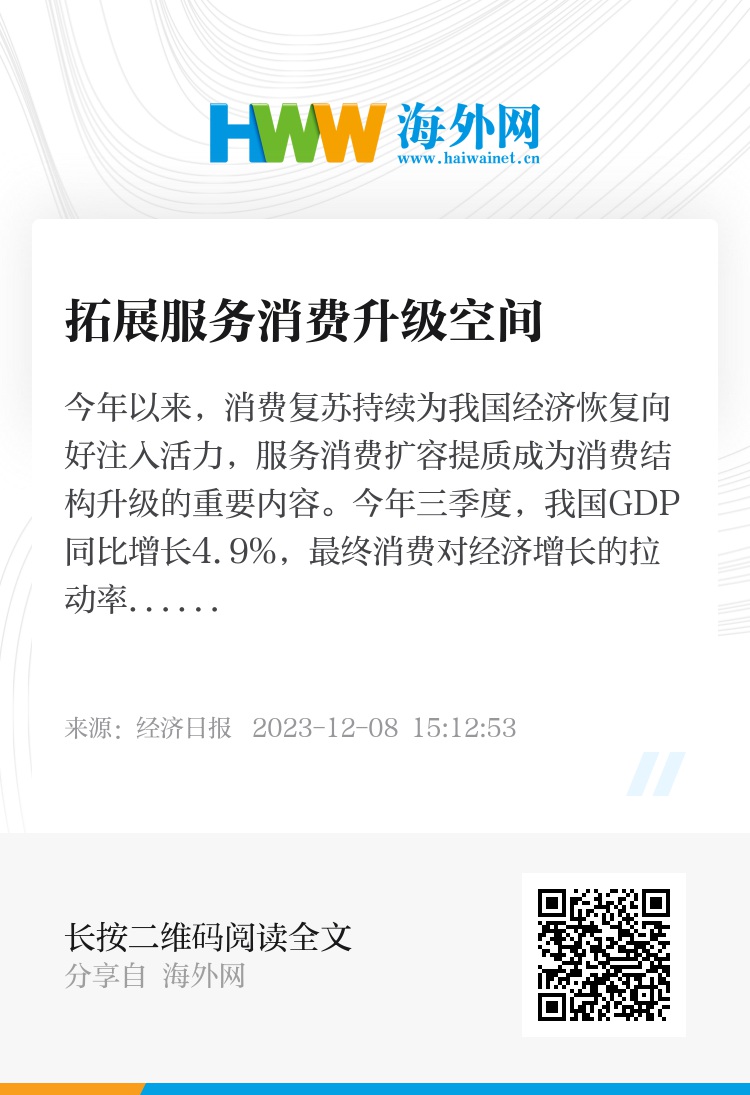 今年以来,消费复苏持续为我国经济恢复向好注入活力,服务消费扩容提质成为消费结构升级的重要内容。今年三季度,我国GDP同比增长4.9%,最终消费对经济增长的拉动率达4.65%、贡献率升至94.84%。值得关注的是,前三季度,我国居民服务性消费支出同比增长14.2%,服务零售额同比增长18.9%。经济恢复是一个波浪式发展、曲折式前进的过程,需要持续发挥消费拉动经济增长的基础性作用,在重视商品消费的同时,也要看到服务消费正发挥着日益重要的作用。