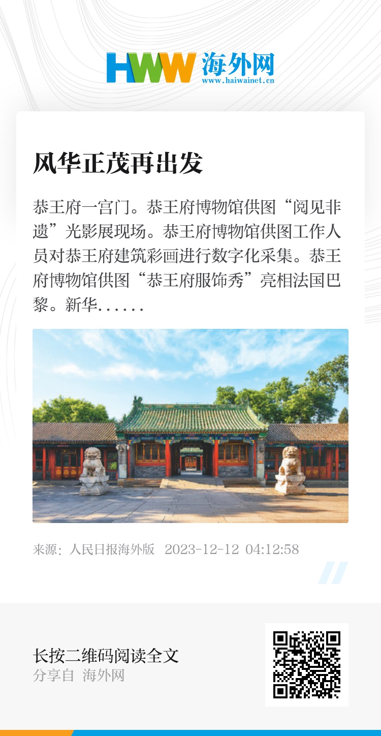 2023年12月14日,恭王府博物馆将迎来创建40周年。“40年来,经过历代恭博人的不懈努力,恭王府博物馆实现了从腾退修缮到全面开放,从全国重点文物保护单位到国家5A级旅游景区、国家一级博物馆的多元并进。”文化和旅游部恭王府博物馆馆长、党委书记冯乃恩说,“我们以‘走,去恭博’为口号推出系列展览和活动,回顾恭博40年发展历程,同时也站在新起点上展望美好未来。”