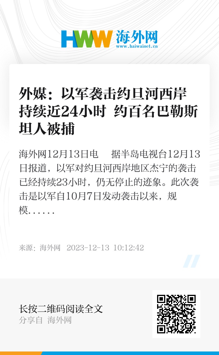 海外网12月13日电 据半岛电视台12月13日报道,以军对约旦河西岸地区杰宁的袭击已经持续23小时,仍无停止的迹象。此次袭击是以军自10月7日发动袭击以来,规模最大、持续时间最长的袭击之一。