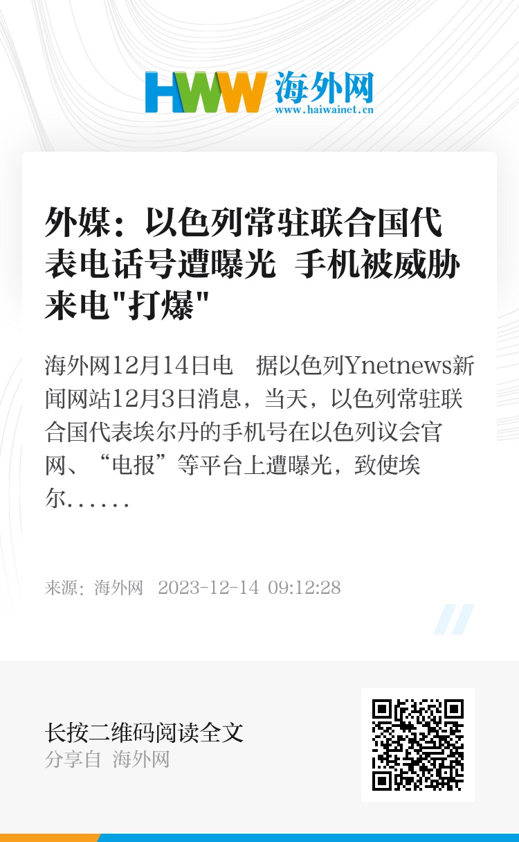 海外网12月14日电 据以色列Ynetnews新闻网站12月3日消息,当天,以色列常驻联合国代表埃尔丹的手机号在以色列议会官网、“电报”等平台上遭曝光,致使埃尔丹的手机被威胁电话“打爆”。