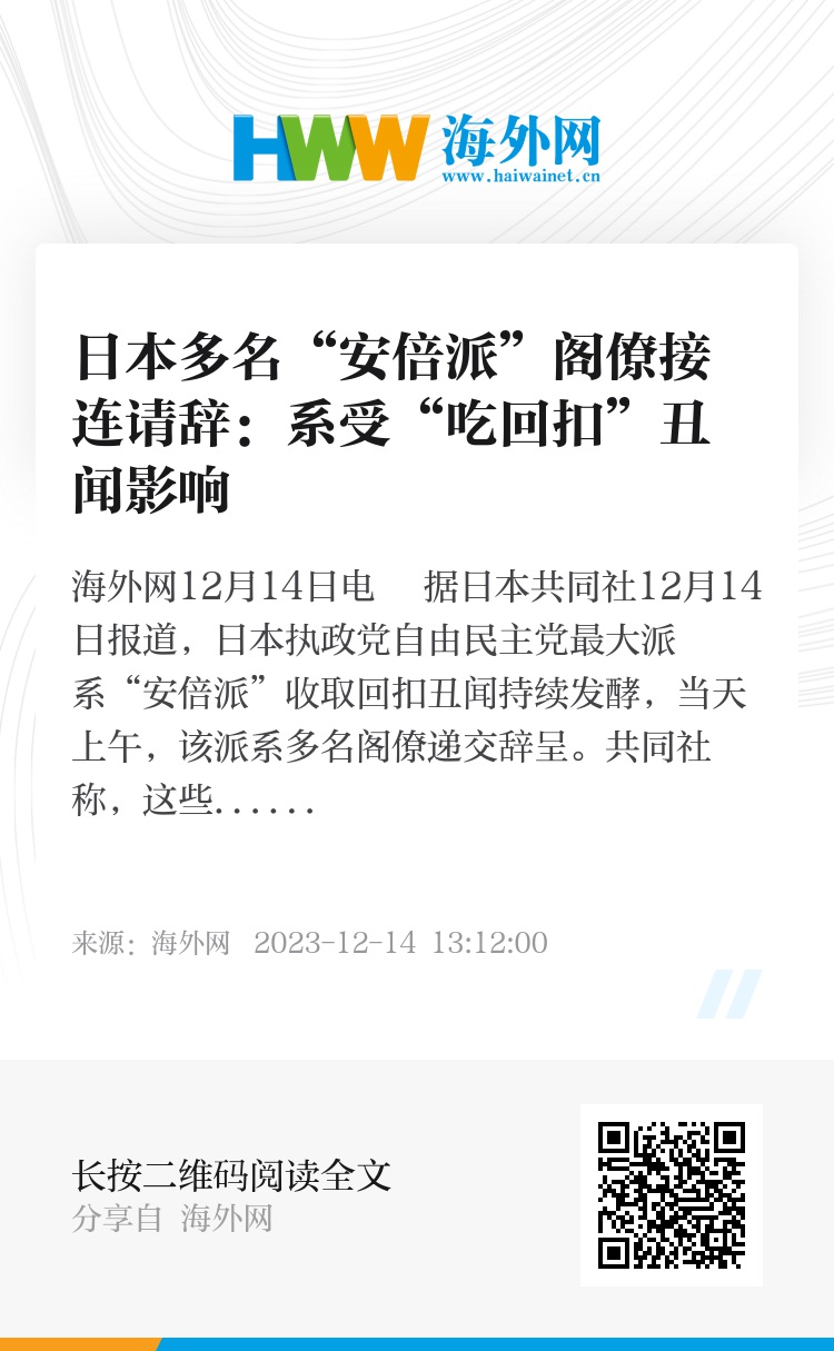 海外网12月14日电 据日本共同社12月14日报道,日本执政党自由民主党最大派系“安倍派”收取回扣丑闻持续发酵,当天上午,该派系多名阁僚递交辞呈。共同社称,这些阁僚实际上是被撤换。