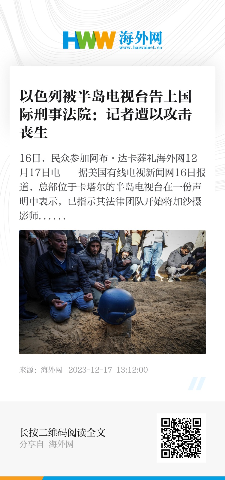 海外网12月17日电 据美国有线电视新闻网16日报道,总部位于卡塔尔的半岛电视台在一份声明中表示,已指示其法律团队开始将加沙摄影师萨米尔·阿布·达卡遇害案移交国际刑事法院,达卡于15日在以色列的袭击中死亡。