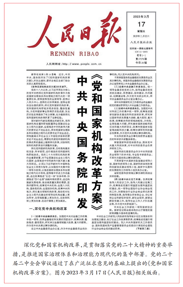 2023年2月,党的二十届二中全会审议通过《党和国家机构改革方案》,推动党对社会主义现代化建设的领导在机构设置上更加科学、在职能配置上更加优化、在体制机制上更加完善、在运行管理上更加高效。