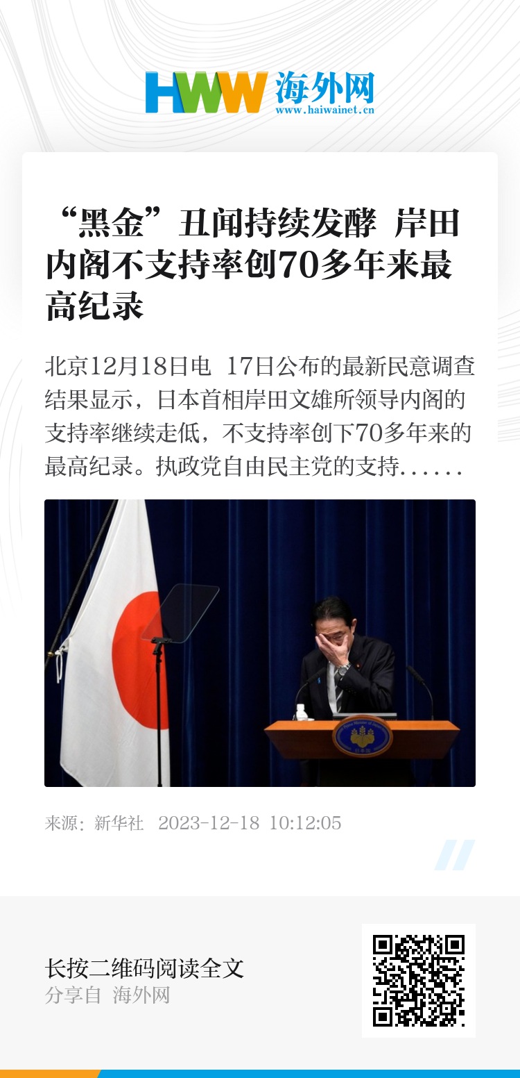 新华社北京12月18日电 17日公布的最新民意调查结果显示,日本首相岸田文雄所领导内阁的支持率继续走低,不支持率创下70多年来的最高纪录。执政党自由民主党的支持率也创十多年来新低。