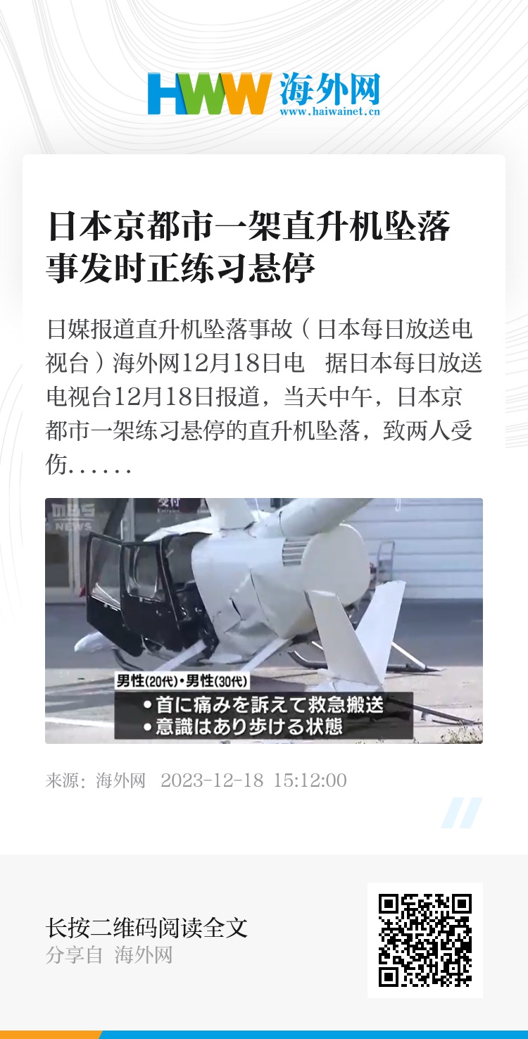 海外网12月18日电 据日本每日放送电视台12月18日报道,当天中午,日本京都市一架练习悬停的直升机坠落,致两人受伤。