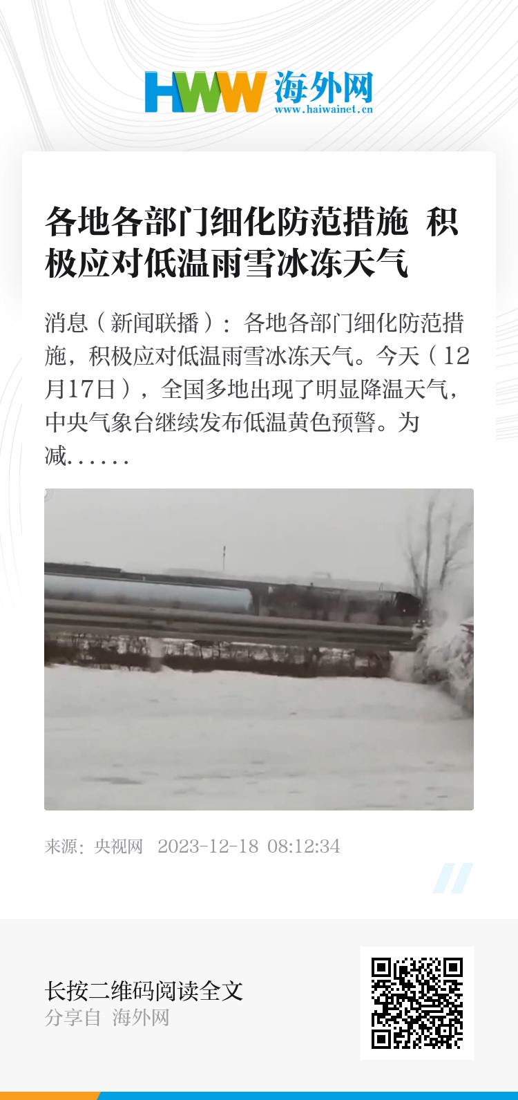 央视网消息(新闻联播):各地各部门细化防范措施,积极应对低温雨雪冰冻天气。