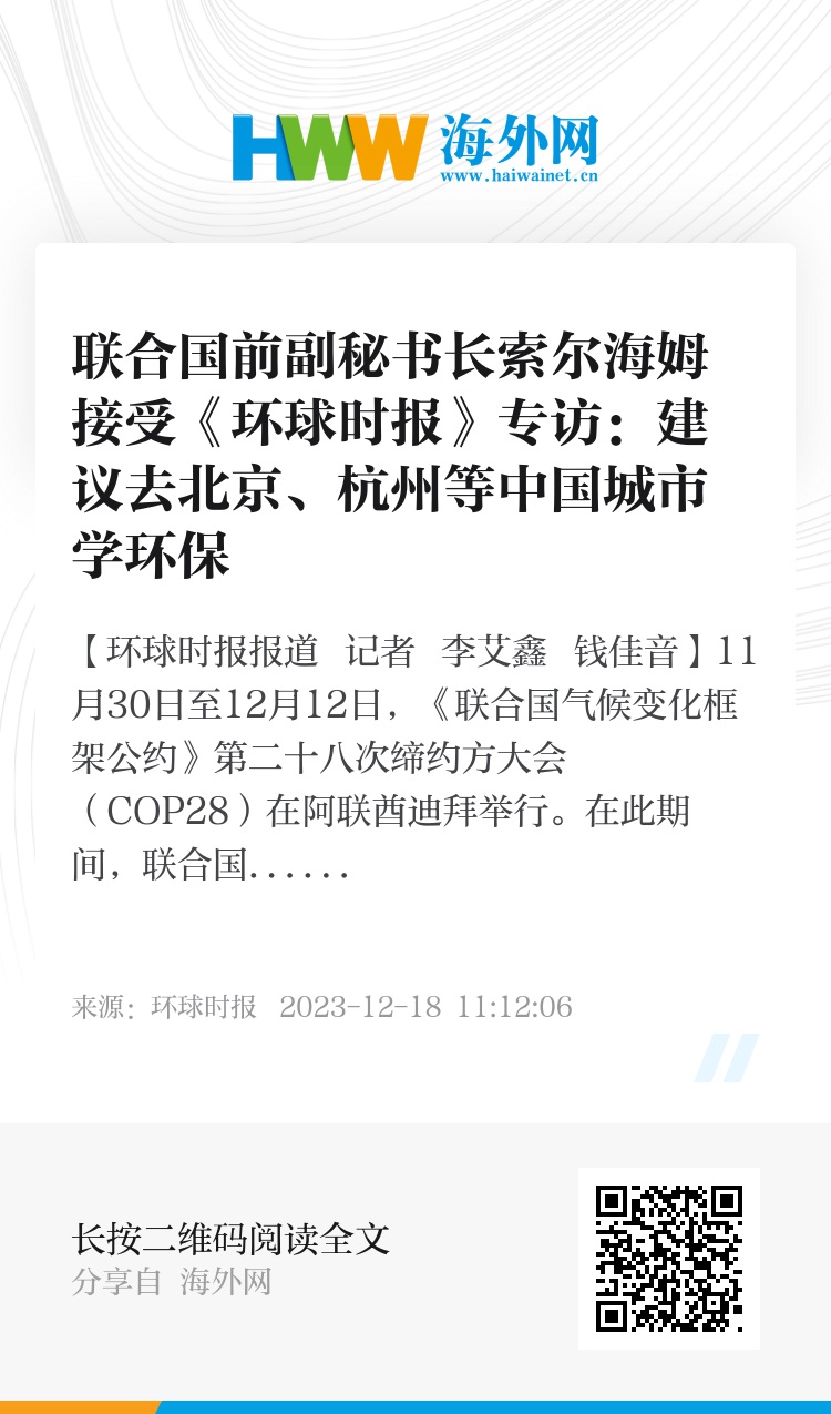 【环球时报报道 记者 李艾鑫 钱佳音】11月30日至12月12日,《联合国气候变化框架公约》第二十八次缔约方大会(COP28)在阿联酋迪拜举行。在此期间,联合国前副秘书长、联合国环境规划署前执行主任埃里克·索尔海姆接受了《环球时报》记者的专访。索尔海姆目前担任世界资源研究所高级顾问,曾获联合国环境规划署的“地球卫士奖”等荣誉。他表示,气候危机是由发达国家造成的,因此这些国家应该对此负责。对于中美应该如何合作应对气候危机,索尔海姆认为关键在于开放互惠贸易和投资,以推动绿色经济的发展和绿色技术的交流,“以前,我总是建议那些寻找保护环境方法的国家去布鲁塞尔、巴黎和柏林,而现在,我会告诉它们去北京、深圳和杭州”。