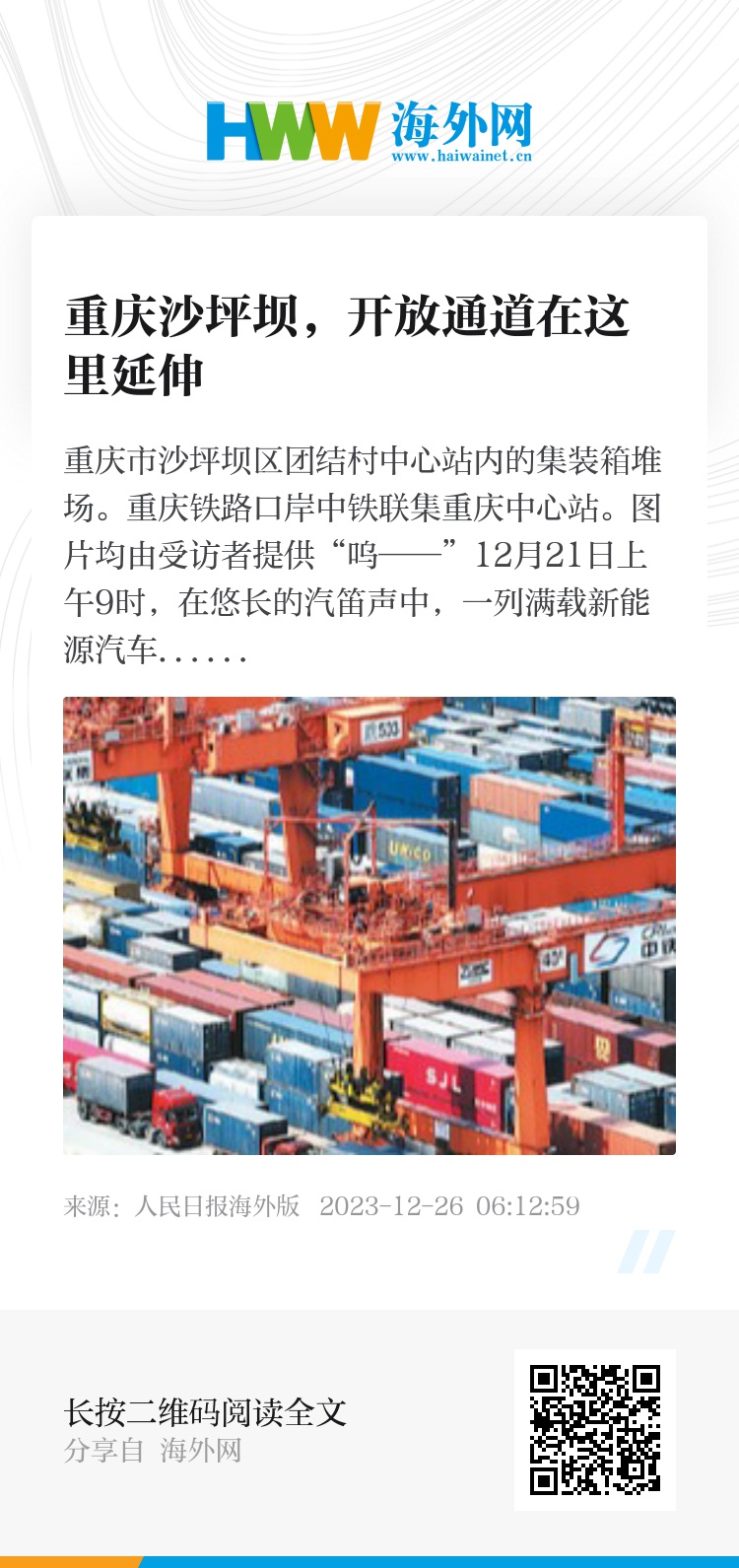 沙坪坝,全国第一列中欧班列(渝新欧)从这里驶出。如今,沙坪坝不仅是中欧班列的始发地,还成为西部陆海新通道的策源地,陆上通达近40个国家超100个城市,海上通达全球120个国家和地区的480个港口,形成“四向齐发”国际通道格局,外贸进出口额占重庆市四成以上,越来越多“中国造”产品从这里走出国门,抵达世界各地。