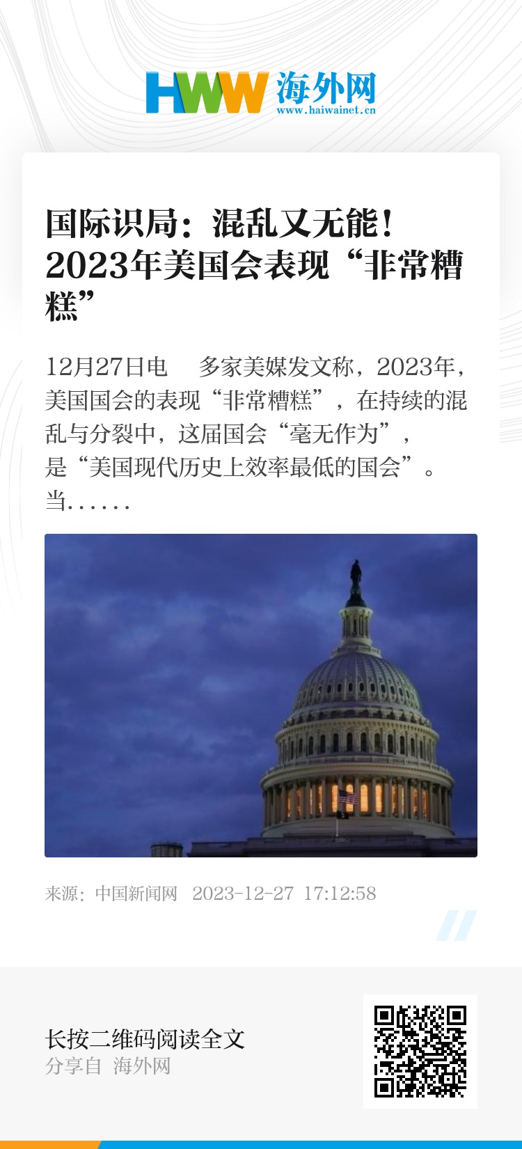 中新网12月27日电 多家美媒发文称,2023年,美国国会的表现“非常糟糕”,在持续的混乱与分裂中,这届国会“毫无作为”,是“美国现代历史上效率最低的国会”。