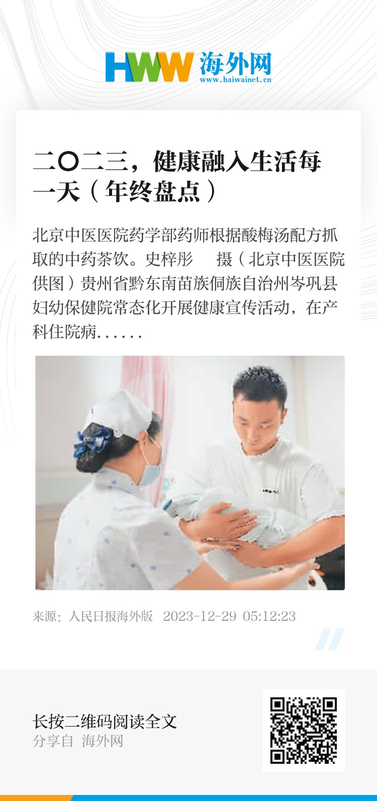 2023年,我们迎来了一项项“健康大礼包”:健康知识更多更丰富了,种植牙降价了,医学检查检验结果互通共享的医院变多了,老年餐厅吃得更舒心了……一件件涉及健康的“小烦恼”解决了,百姓的健康获得感大大增强。