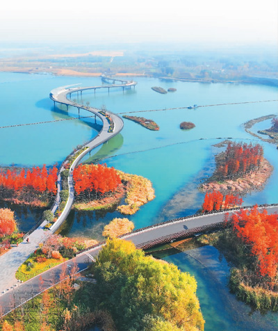 作为长三角生态绿色一体化发展示范区内首座大型景观步行桥,元荡慢行桥横跨沪苏两地。它不仅连接着上海青浦和江苏吴江,还将元荡湖两岸的湿地景观和环湖绿道对接,串联起周边丰富的生态旅游资源和人文资源。图为12月5日,俯瞰元荡慢行桥。王建中 摄(人民视觉)