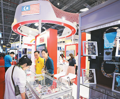 一年一度的中国国际进口博览会,成为越来越多“一带一路”共建国家展商的机遇和平台。图为2023年11月6日,参观者在第六届进博会国家展马来西亚展台欣赏展出的珠宝首饰。新华社记者 李梦娇 摄