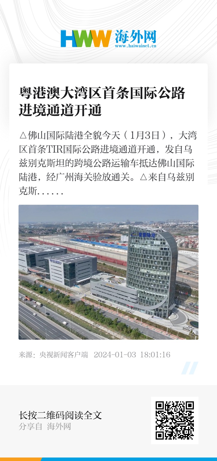 今天(1月3日),大湾区首条TIR国际公路进境通道开通,发自乌兹别克斯坦的跨境公路运输车抵达佛山国际陆港,经广州海关验放通关。