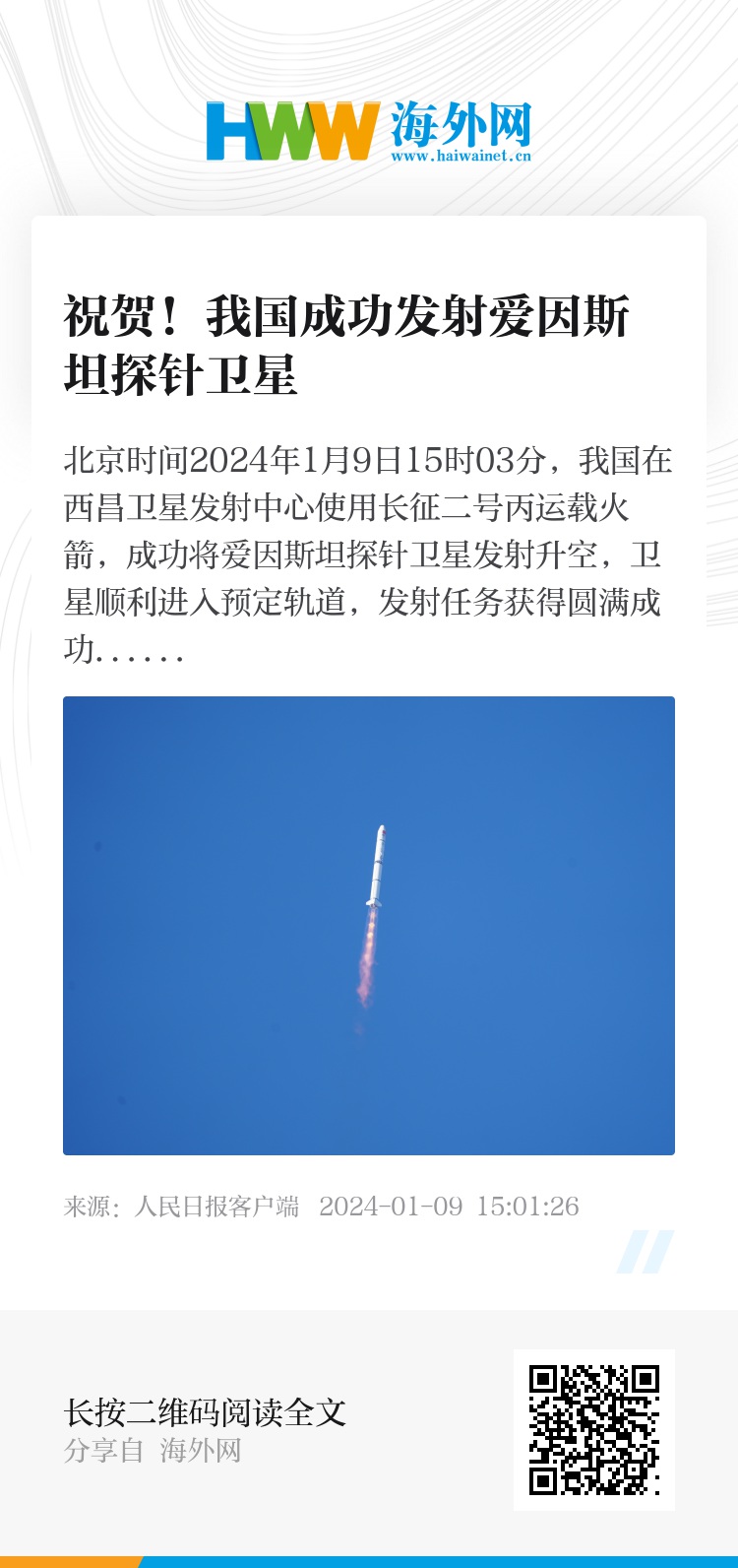 北京时间2024年1月9日15时03分,我国在西昌卫星发射中心使用长征二号丙运载火箭,成功将爱因斯坦探针卫星发射升空,卫星顺利进入预定轨道,发射任务获得圆满成功。