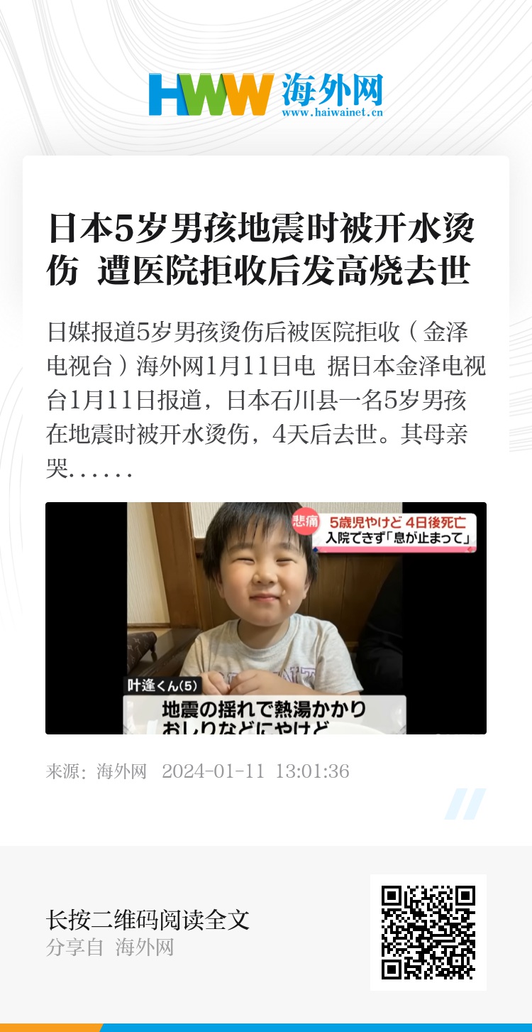 海外网1月11日电 据日本金泽电视台1月11日报道,日本石川县一名5岁男孩在地震时被开水烫伤,4天后去世。其母亲哭诉,家中因停水无法给孩子降温,医院也拒收住院,孩子在高烧中痛苦死去。