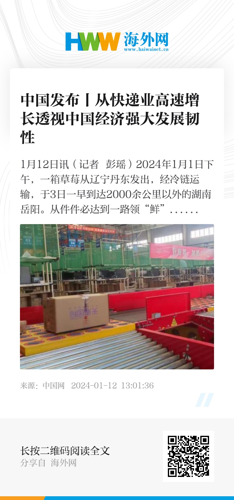 中国网1月12日讯(记者 彭瑶)2024年1月1日下午,一箱草莓从辽宁丹东发出,经冷链运输,于3日一早到达2000余公里以外的湖南岳阳。从件件必达到一路领“鲜”,高效的现代快递产业让跨区域、跨季节、多品种的消费需求得以实现。