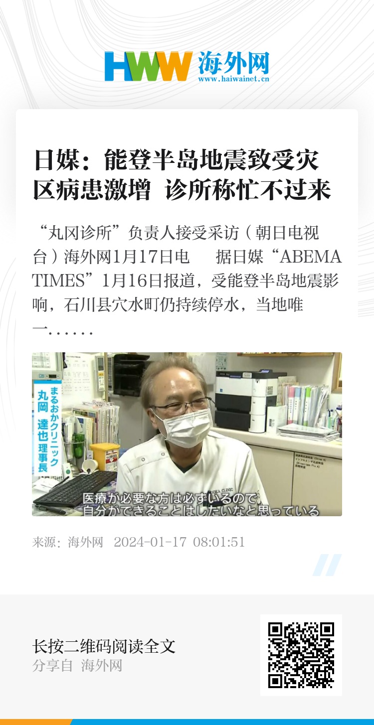 海外网1月17日电 据日媒“ABEMA TIMES”1月16日报道,受能登半岛地震影响,石川县穴水町仍持续停水,当地唯一的儿科诊所称患者太多,忙不过来。