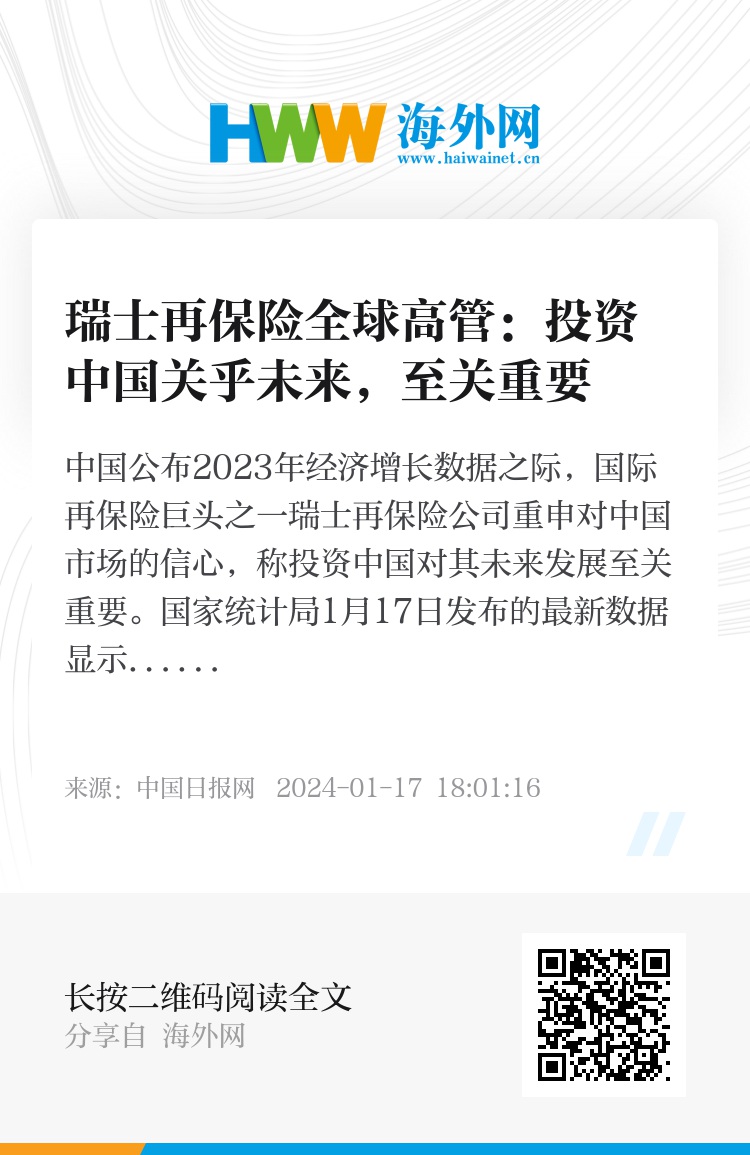 中国公布2023年经济增长数据之际,国际再保险巨头之一瑞士再保险公司重申对中国市场的信心,称投资中国对其未来发展至关重要。