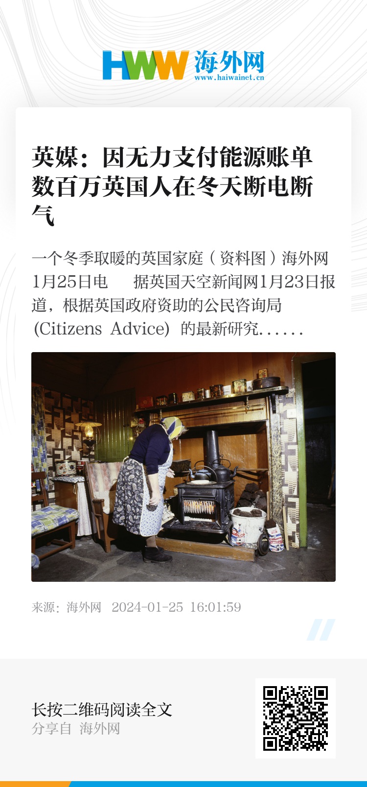 海外网1月25日电 据英国天空新闻网1月23日报道,根据英国政府资助的公民咨询局 (Citizens Advice) 的最新研究,因无力支付持续增长的能源账单债务,数百万英国人被迫在冬天切断天然气和电力服务。