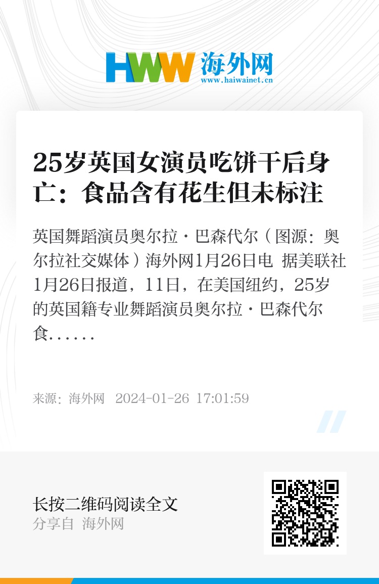 海外网1月26日电 据美联社1月26日报道,11日,在美国纽约,25岁的英国籍专业舞蹈演员奥尔拉·巴森代尔食用饼干后,因花生重度过敏身亡。据悉,相关饼干未标注含有花生成分。
