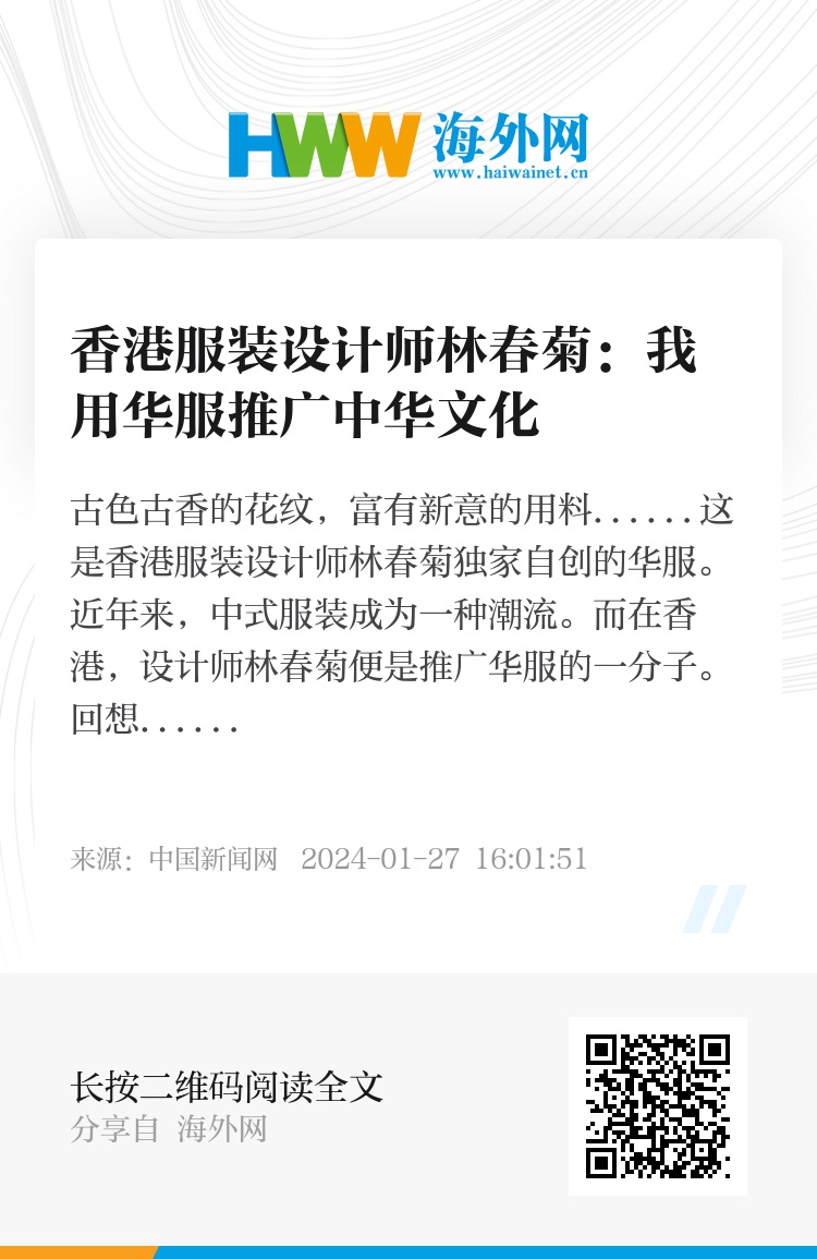 古色古香的花纹,富有新意的用料......这是香港服装设计师林春菊独家自创的华服。近年来,中式服装成为一种潮流。而在香港,设计师林春菊便是推广华服的一分子。回想起过去,林春菊认为是童年经历启蒙了她成为服装设计师。