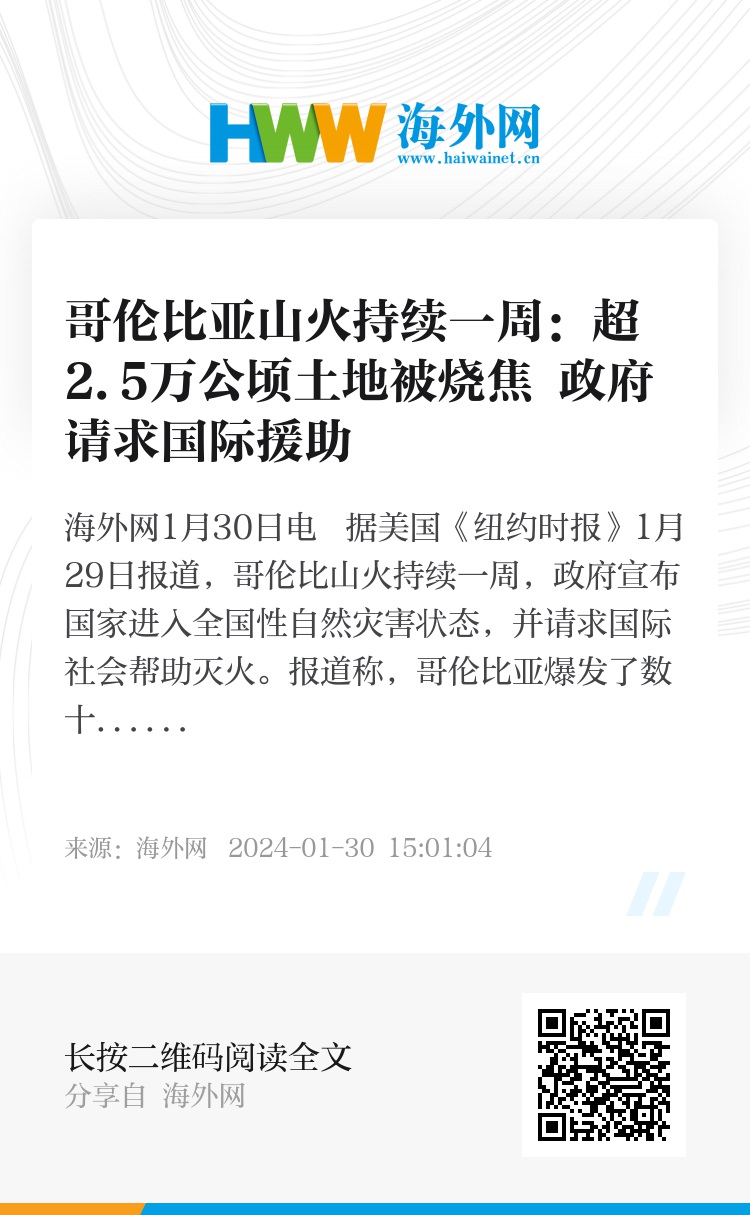 海外网1月30日电 据美国《纽约时报》1月29日报道,哥伦比山火持续一周,政府宣布国家进入全国性自然灾害状态,并请求国际社会帮助灭火。