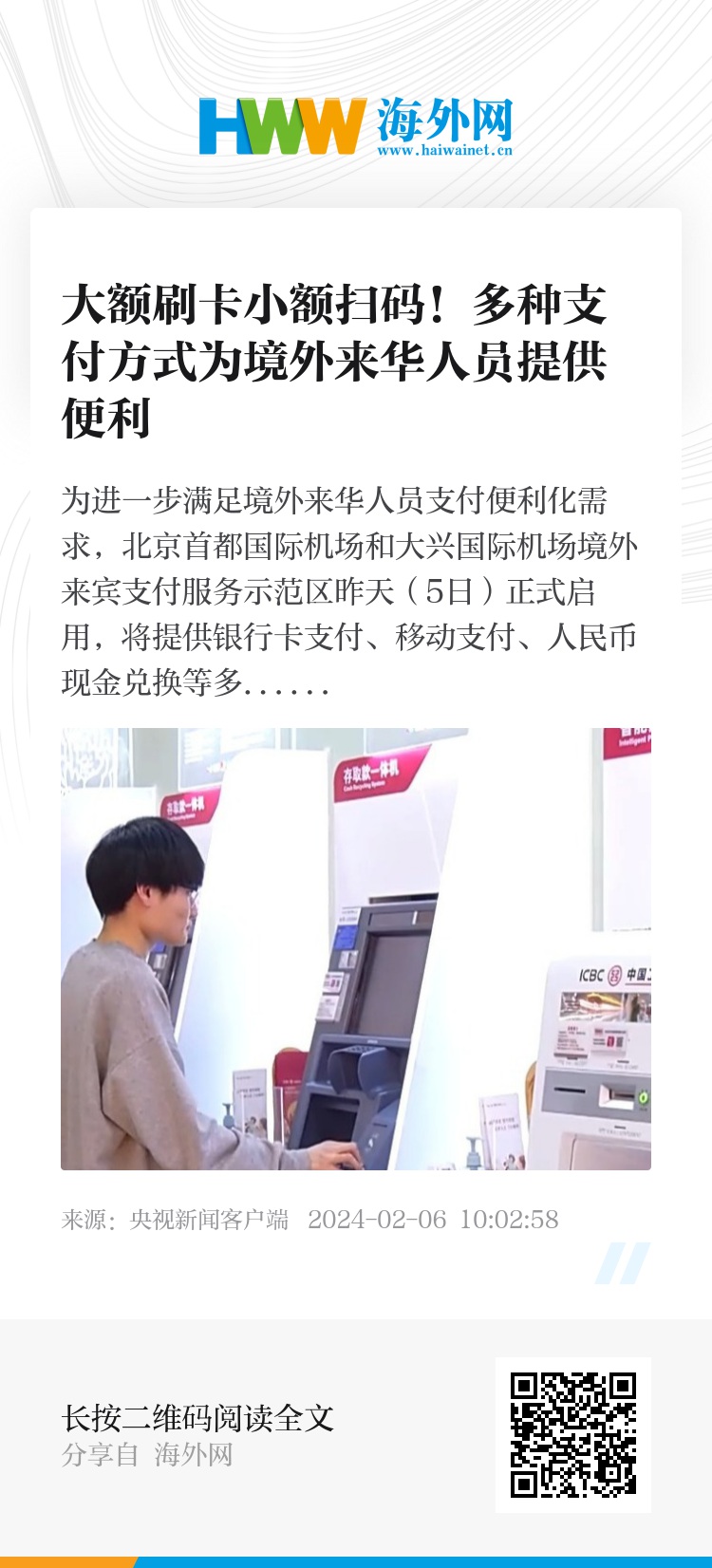 针对境外来华人士关心的现金取现问题,中国人民银行还组织银行开展ATM外卡受理改造,提升支持外卡取现的ATM覆盖率。